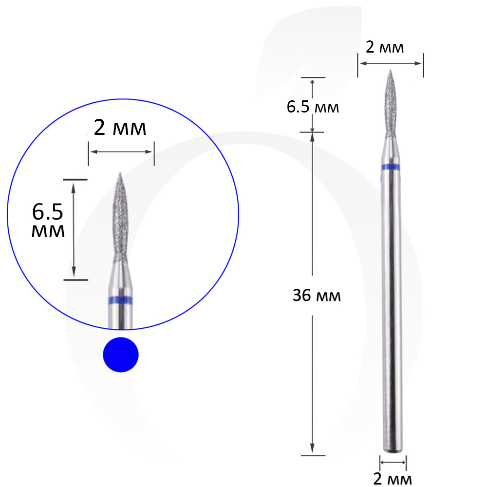 Фреза алмазна полум'я синя 2 мм, робоча частина 6.5 мм