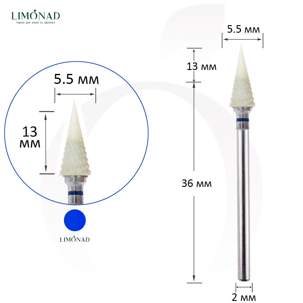 Фреза керамічна гострий конус синій 5.5 мм, робоча частина 13 мм