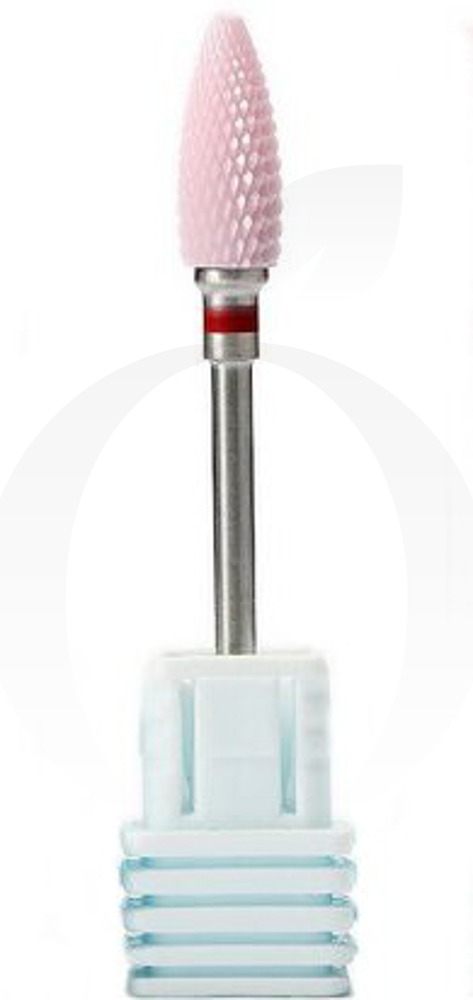 - Дрібний абразив. Насадка червоного кольору. Призначений для зняття гель-лаку, корекції нарощених нігтів. Обтічна форма дозволяє легко проходити ділянки у кутикули і вздовж бічних валиків.