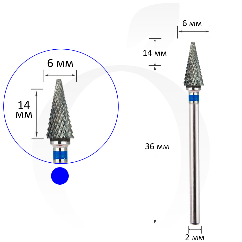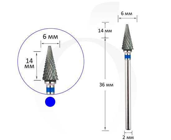 Фреза твердосплавна конус гострий синій 6 мм, робоча частина 14 мм