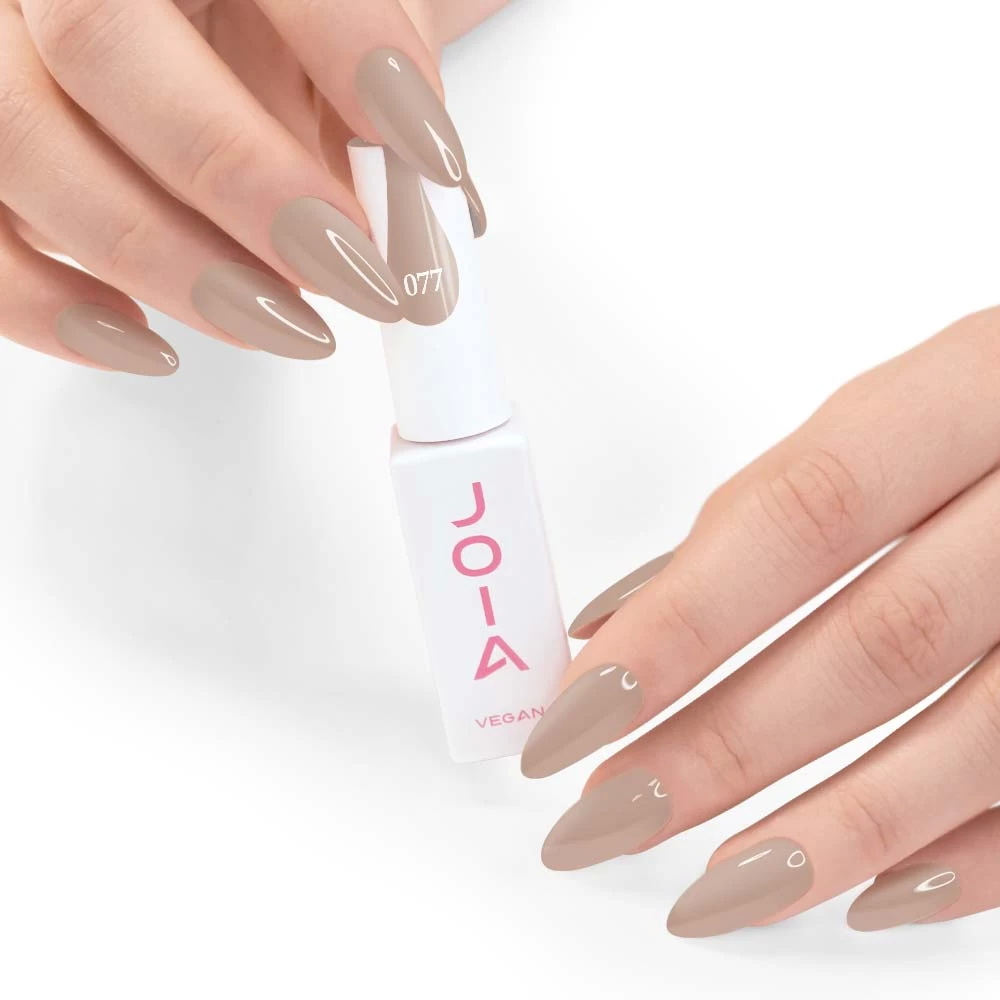 Гель-лак 077 JOIA vegan 一 гель-лак розкішного пісочного відтінку. Теплий характер цього кольору випромінює витонченість, впевненість та жіночу силу. Такий відтінок надихає, наче Ви насолоджуєтесь неймовірною красою піщаних дюн. Він заряджений на натхнення, тому приготуйтесь до потужного потоку нових nail-ідей.