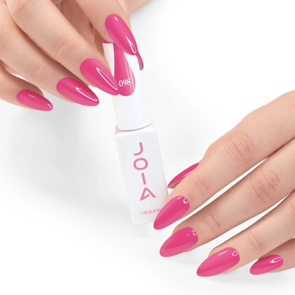 Гель-лак 098 JOIA vegan 一 неоновий рожевий, який спонукає Вас розширювати свої модні кордони. Любов до найрізноманітніших відтінків pink палітри не згасне ніколи, адже хедлайнером завжди буде такий неоновий пігмент. На коротких нігтях у формі чіткого квадрата цей колір має фантастично привабливий та магнетичний вигляд.