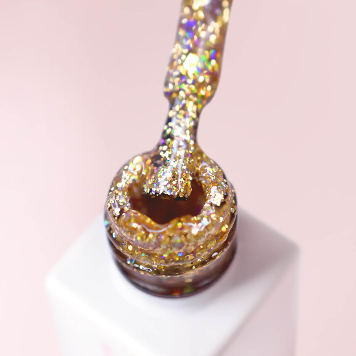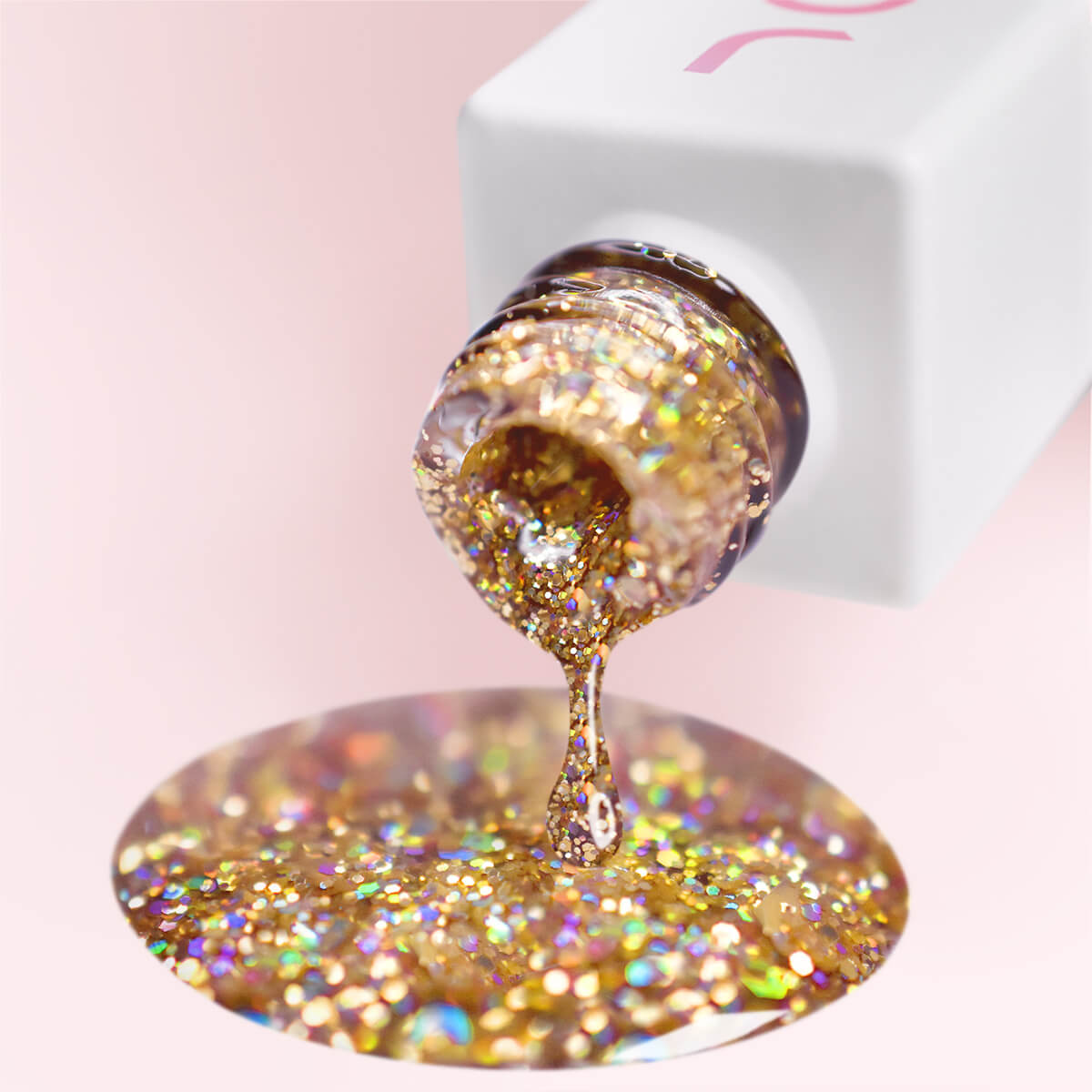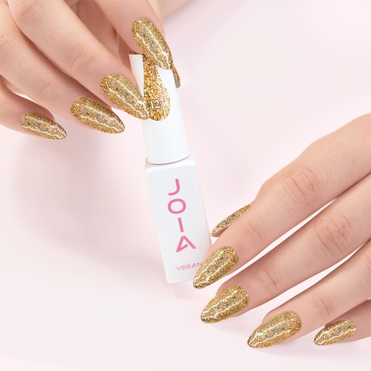 UV/LED Gel Polish JOIA vegan 127 – чаруючий золотистий відтінок гель-лаку, наповнений різноформатними голографічними блискітками. Такий колір – це той «вау-ефект», якого бажають всі! Неймовірні барви переливів та сяйво золота нагадують зорі, дивлячись на які, забуваєш про все на світі. Обираючи цей гель-лак для Вашого манікюру, будьте готові до жадібних поглядів та захвату!