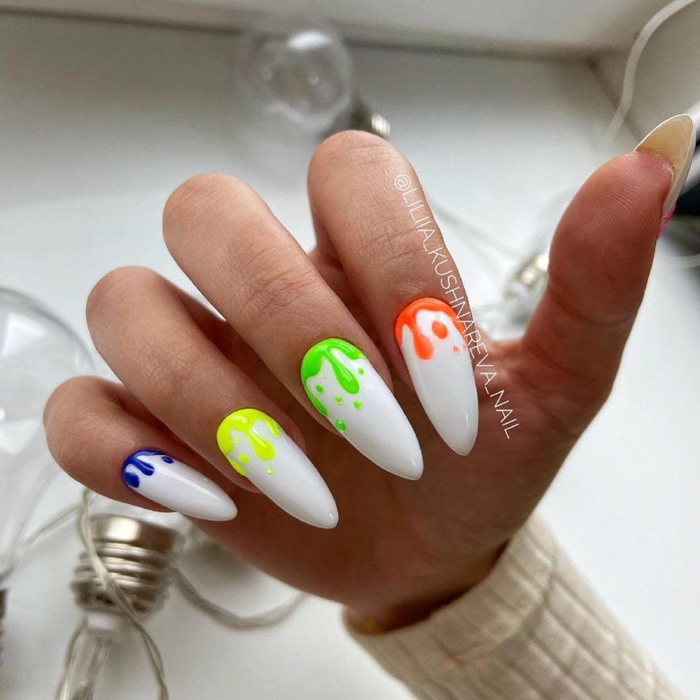 - Нанесіть Kira Nails FLUO тонким шаром поверх кольорового гель-лаку та просушіть в лампі 4 хв.