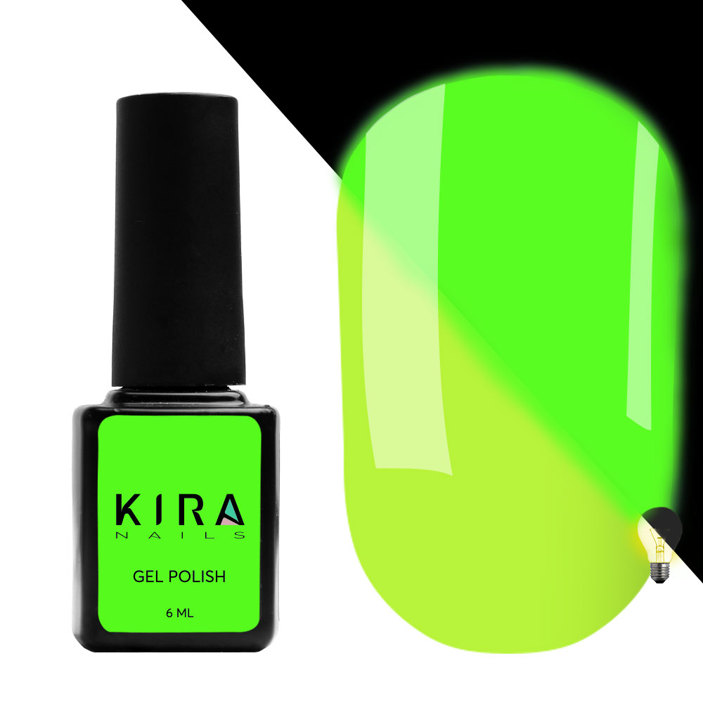 Kira Nails FLUO – флуоресцентні гель-лаки, світяться в темряві при достатній кількості тепла і УФ-променів, радимо перекривати топом без УФ-фільтрів.