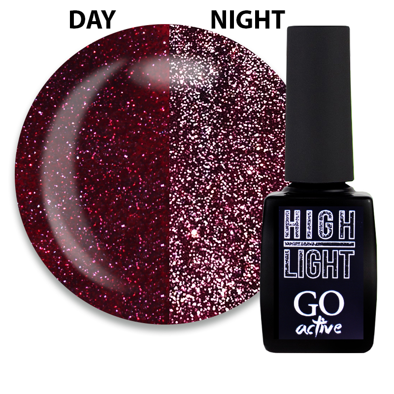 Світловідбиваючий ефект у нейл-дизайні один із найтрендовіших, яскравих та актуальних. GO Active High Light (Го Ектив Хай Лайт) - колекція гель-лакових покриттів, яка дуже вдало передає його і дозволяє легко втілити на нігтики. Кожен колір грає по-своєму, яскраво сяє і наче розсипає іскорки, як тільки на нього потрапляє промінь світла. Секрет такого ефекту - спеціальні дрібні світловідбиваючі частинки, якими щільно насичена текстура гель-лаків. Їх здатність до світловідбиття дуже висока, тому гель-лаки GO Active High Light буквально заворожують своїм сяйвом, яке змінює інтенсивність від спокійнішої до сліпуче яскравої (залежить від світла). М'яке мерехтіння вдень і максимально сильне під променями нічних софітів - успіх та захоплення гарантовані!