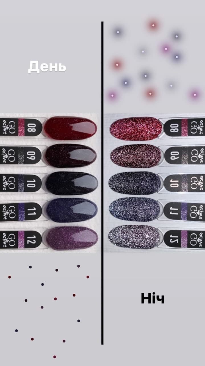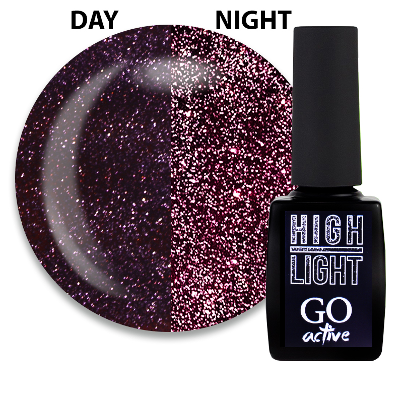 Світловідбиваючий ефект у нейл-дизайні один із найтрендовіших, яскравих та актуальних. GO Active High Light (Го Ектив Хай Лайт) - колекція гель-лакових покриттів, яка дуже вдало передає його і дозволяє легко втілити на нігтики. Кожен колір грає по-своєму, яскраво сяє і наче розсипає іскорки, як тільки на нього потрапляє промінь світла. Секрет такого ефекту - спеціальні дрібні світловідбиваючі частинки, якими щільно насичена текстура гель-лаків. Їх здатність до світловідбиття дуже висока, тому гель-лаки GO Active High Light буквально заворожують своїм сяйвом, яке змінює інтенсивність від спокійнішої до сліпуче яскравої (залежить від світла). М'яке мерехтіння вдень і максимально сильне під променями нічних софітів – успіх та захоплення гарантовані!