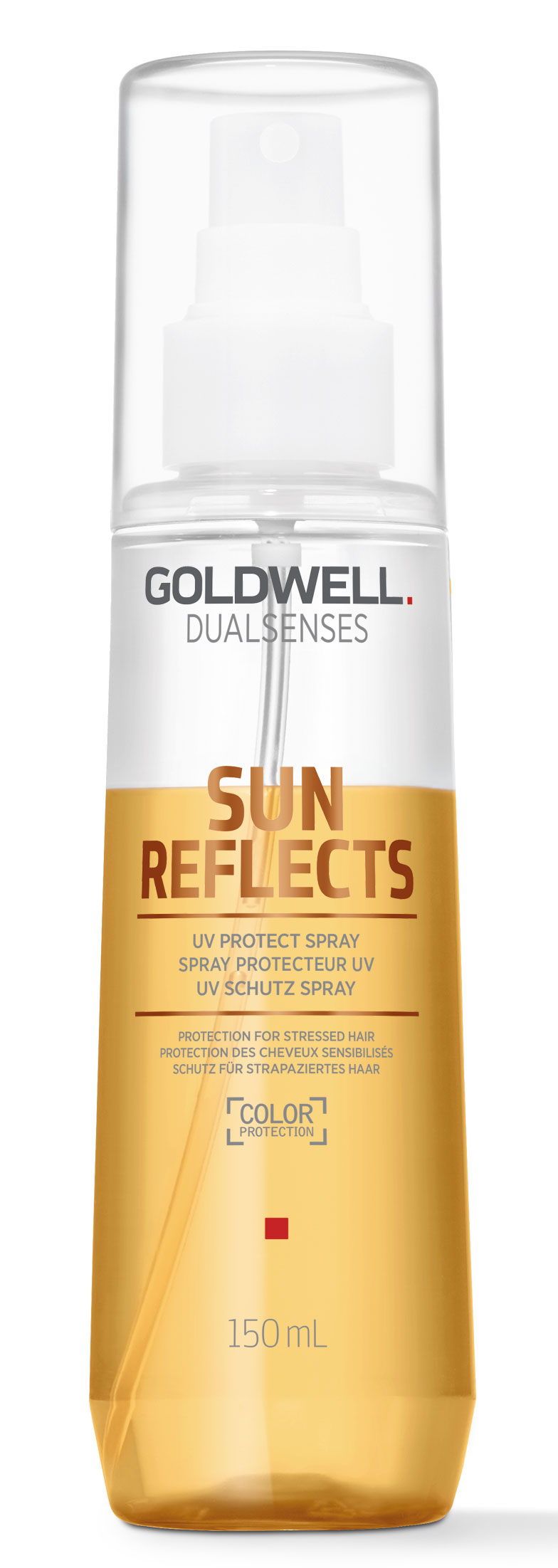 DualSenses Sun Reflects Protect Spray - це приголомшливий спрей для локонів, що забезпечує їх активний захист від вкрай небезпечного ультрафіолету, а також морської солоної та хлорованої води в басейнах. Шикарний засіб від німецького бренду Goldwell збагачений ультрасучасним запатентованим комплексом SunCareComplex, що містить інноваційні сонячні фільтри, олію маракуї та пантенол. Завдяки йому спрей миттєво відновлює гідробаланс у волосяних волокнах, зміцнює їх та захищає від літніх стресів. Як результат, локони зберігають свою дивовижну м'якість, силу, гладкість і глибокий колір навіть при частому впливі різних зовнішніх агресорів.