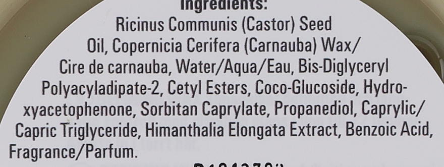 Ricinus Communis (Castor) Seed Oil, Copernicia Cerifera (Carnauba) Wax/ Cire de carnauba, Water/Aqua/Eau, Bis-Diglyceryl Polyacyladipate-2, Cetyl Esters, Coco-Glucoside, Hydroxyacetophenone, Sorbitan Caprylate, Propanediol, Caprylic/ Capric Triglyceride, Himanthalia Elongata Extract, Benzoic Acid, Fragrance/Parfum.