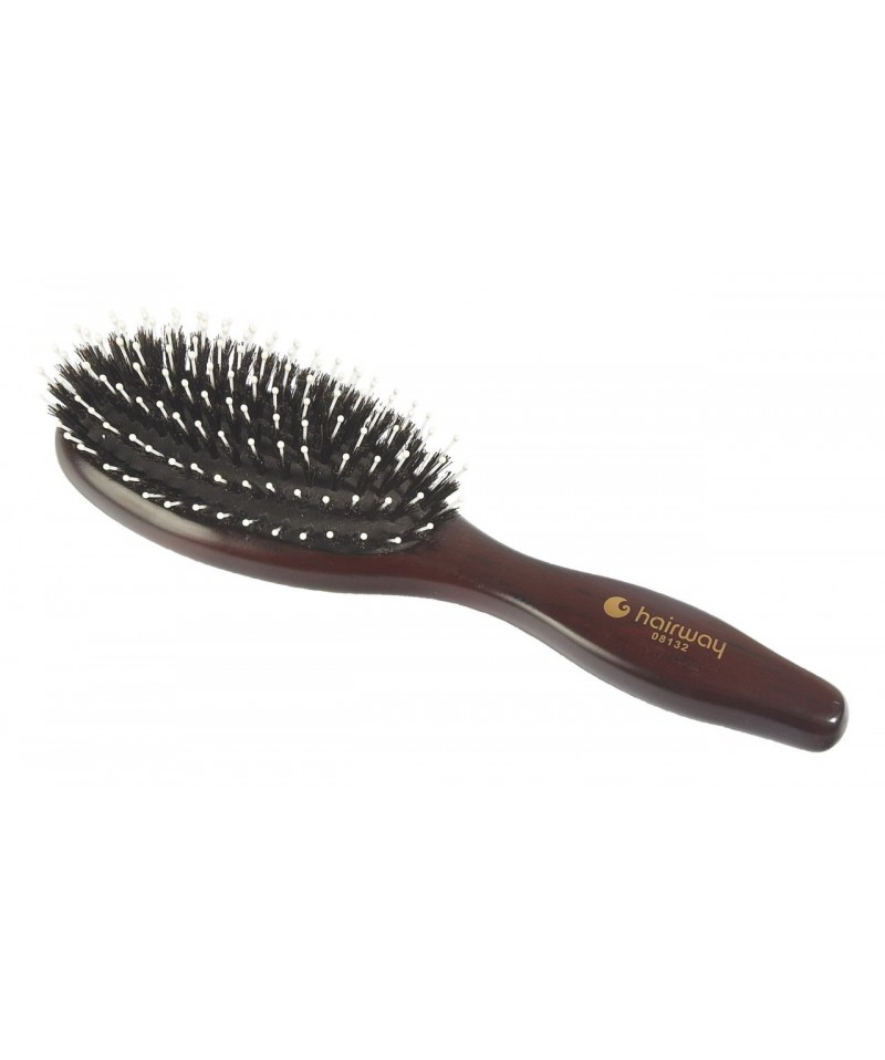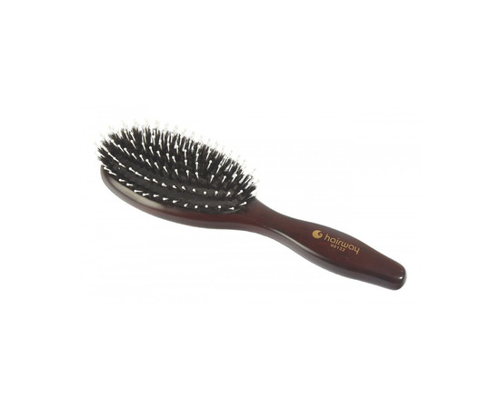 Щітка на дерев'яній основі комбінована з натуральною щетиною та поліамідними штифтами. Натуральна щетина дбайливо взаємодіє з волоссям, надає їм природного блиску. Нейлонові штифти для кращого розчісування, розгладження та надання блиску волоссю.