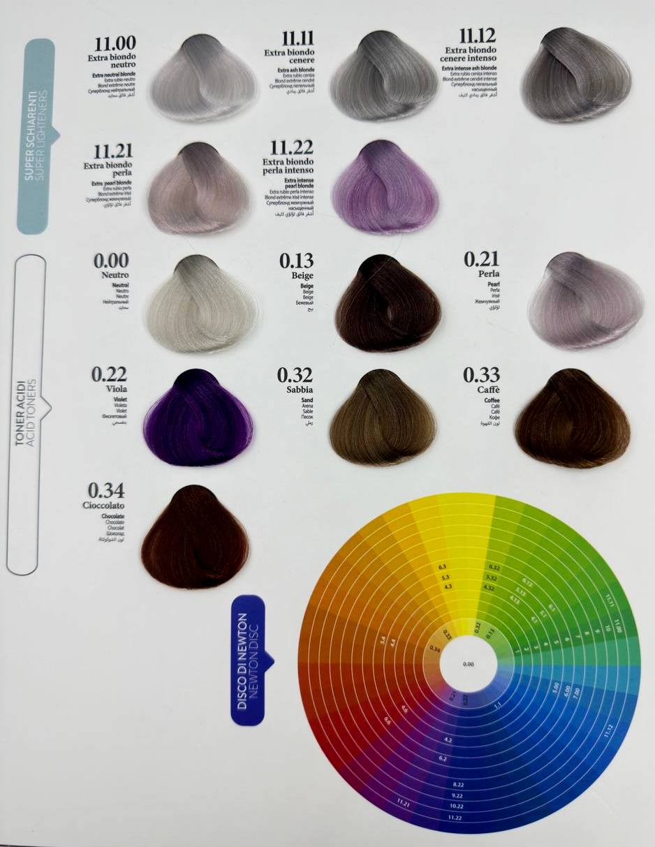 - 5 супер блондів розрахованих на освітлення до 4-х тонів із мікропігментами, які гарантують ідеальний контроль теплих тонів під час процедури освітлення 7 кислотних тонерів. Завдяки збалансованому міксу тонера з окислювачем 1,5% - 3% виходить формула з кислим pH, яка пом'якшує кутикулу і згладжує її, за рахунок чого волосся виглядає більш щільним і блискучим, без освітлення натуральної бази