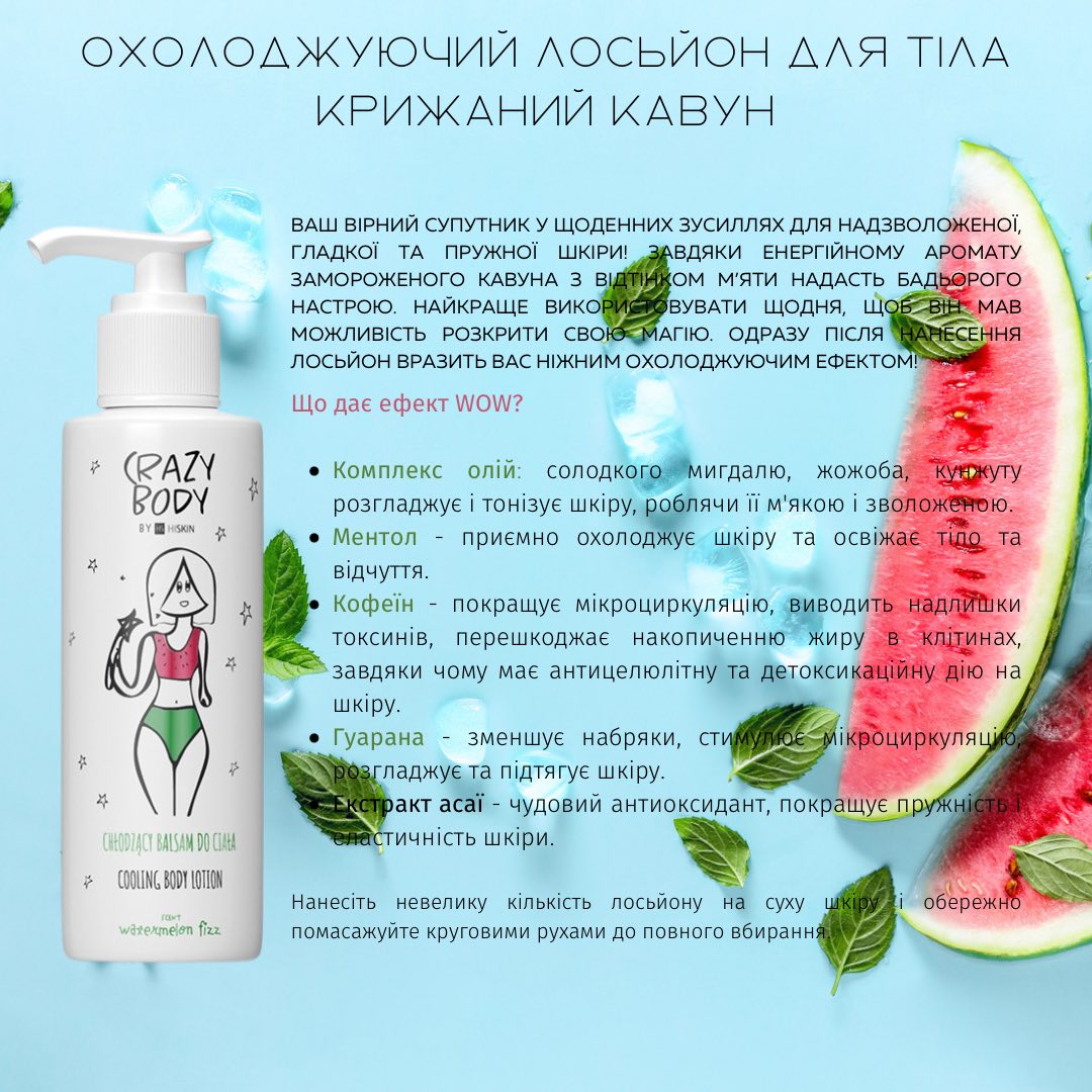 Купити Антицелюлітний охолоджуючий лосьйон для тіла "Кавун та М'ята" HiSkin Crazy Body Cooling Body Lotion Watermelon Fizz, 300 мл, ви зможете у нашому інтернет-магазині limonad з доставкою по всій Україні в тому числі і Київ, Дніпро, Одеса, Харків, Запоріжжя, Одеса, Львів та багато інших населених пунктів.