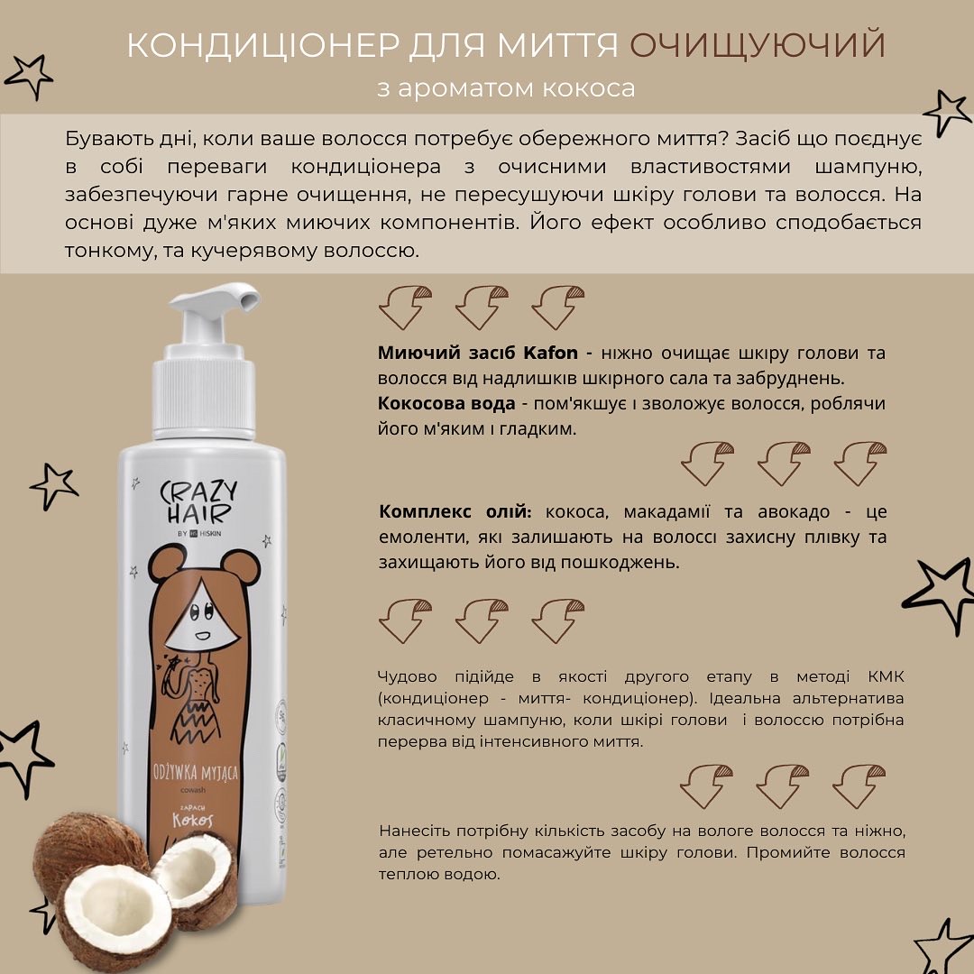 Очищаючий кондиціонер Crazy Hair HiSkin з екстрактом кокосу забезпечує шовковисте волосся без пересушування! Цей продукт поєднує в собі переваги кондиціонера та дуже м'яких компонентів, що очищають. Він ретельно очищує волосся, не пересушуючи шкіру голови та волосся. Кафоновий миючий засіб м'яко очищує шкіру голови та волосся від забруднень та надлишків шкірного сала. А суміш олій кокосу, макадамії та авокадо залишає на волоссі захисну плівку, що оберігає їх від зовнішніх пошкоджень. Кокосова вода зволожує волосся, роблячи його гладким на дотик.