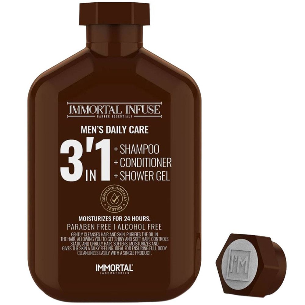 Immortal Infuse Men’s Daily Care 3 in 1 — це універсальний засіб, який чудово поєднує в собі відразу три продукти: шампунь із зволожуючим ефектом, кондиціонер для живлення пошкодженого волосся та гель для душу, який глибоко очищає. Такий дбайливий щоденний догляд обов’язково сподобається кожному чоловікові!Засіб не містить спирту та парабенів, тому не спричиняє подразнення та підходить для всіх типів шкіри і волосся. М’яка формула косметичного продукту збагачена корисними рослинними екстрактами.Шампунь Immortal Infuse Men’s Daily Care якісно очищає волосся, а кондиціонер відновлює оптимальний гідробаланс, живить, пом’якшує та не обтяжує. Водночас гель для душу добре доглядає за шкірою тіла, делікатно видаляючи всі забруднення.