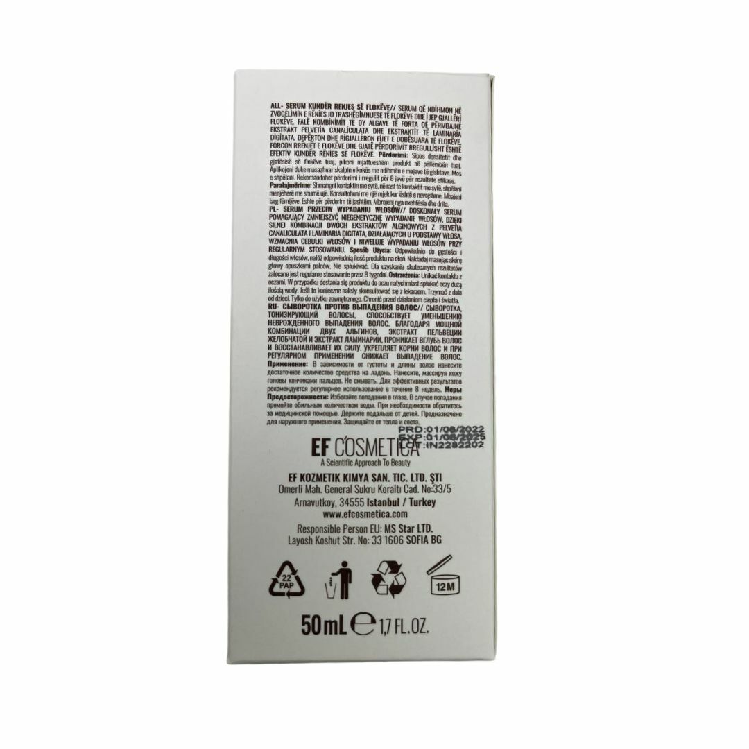 Сироватка проти випадіння волосся Immortal. Тонізує, зменшує випадіння пошкодженного волосся. Завдяки потужній комбінації двох альгінів, екстракт пельвеції жолобчастої і екстракт ламінарії, проникає в глибину волосся і відновлює їх силу. Зміцнює корені волосся і при регулярному застосуванні знижує випадіння волосся.Застосування: В залежності від густоти і довжини волосся, нанесіть достатню кількість засобу на долоні. Нанесіть масажуючи шкіру голови кінчиками пальців. Не змивайте. Для ефективного результату, рекомендується регулярне використання протягом 8-ми тижнів.Запобіжні заходи: Уникайте потрапляння в очі. У разі потрапляння промийте великою кількістю води. За потреби зверніться за медичною допомогою. Тримайте подалі від дітей. Призначений для зовнішнього застосування.