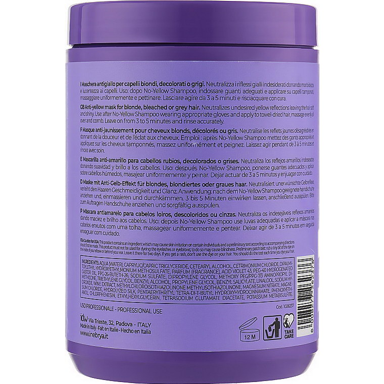 Власниці знебарвлених сивих і світлих локонів завжди стикаються з одним небажаним ефектом - появою жовтих плям, що мають некрасивий і недоглянутий вигляд. Вирішити цю проблему зможе маска бренда Inebrya, збагачена фіолетовими пігментами. Б’юті-продукт ефективно кондиціонує локони, нейтралізуючи жовті відтінки, та дарує їм м'якість. За регулярного застосування волосся стає «холоднішим» за кольором і блискучим.