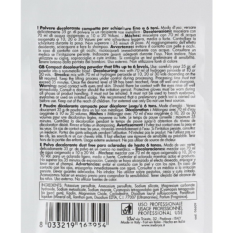 Potassium persulfate, Ammonium persulfate, Sodium silicate, Magnesium carbonate hydroxide, Sodium metasilicate, Sodium stearate, Cyamopsis tetragonoloba gum, Kaolin, Magnesium oxide, Cyclodextrin, Disodium lauryl sulfosuccinate, Mineral oil, Xanthan gum, Disodium EDTA, Ultramarines, Fragrance