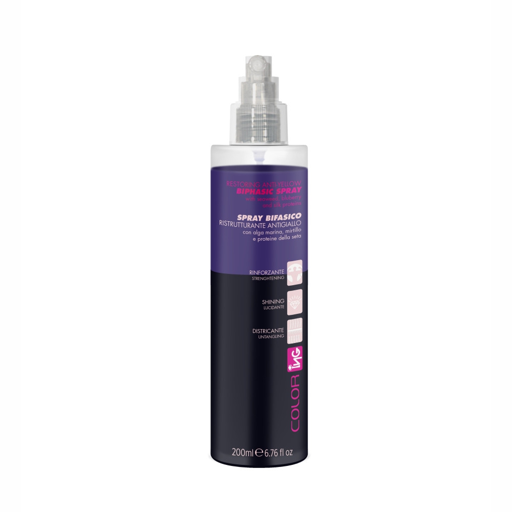 Відновлюючий двофазний спрей ING Coloring Restoring Anti-Yellow спеціально розроблений для сухого, пошкодженого, освітленого та сивого волосся. Він нейтралізує жовтизну, надає блиск та зволожує волосся, не обтяжуючи його.