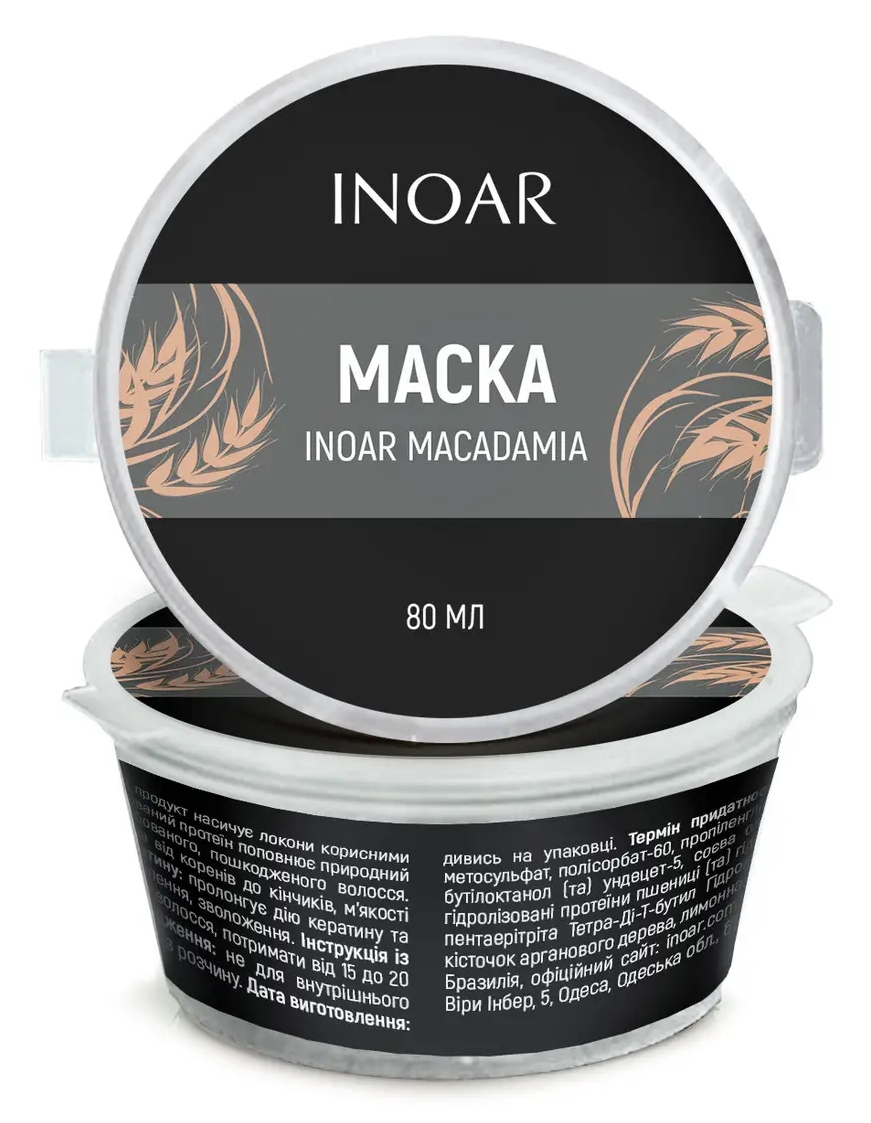 Ліпідна зволожуюча та відновлююча маска для волосся з олією макадамії від Іноар.