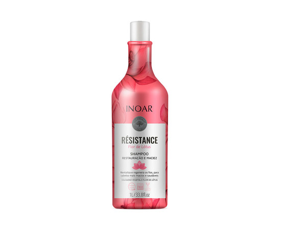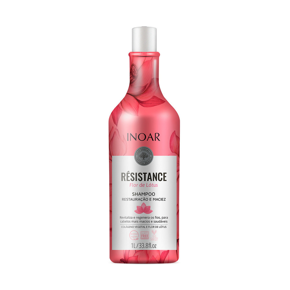Шампунь INOAR Resistance Flor de Lotus відновлює волосся, надає їм м'якості та блиску. Шампунь м'яко очищає, не сушить волосся, зволожує та пожвавлює його. Це освіжаюча сила, яка пом'якшує волосся та створює ефект надзвичайного сяйва.