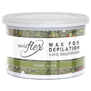 Теплий віск у банці Italwax FLEX Водорості — дуже пластичний віск насиченого зеленого кольору, з екстрактом ламінарії. Підходить для сухої та чутливої шкіри. Видаляється без залишку за допомогою смуг для депіляції.