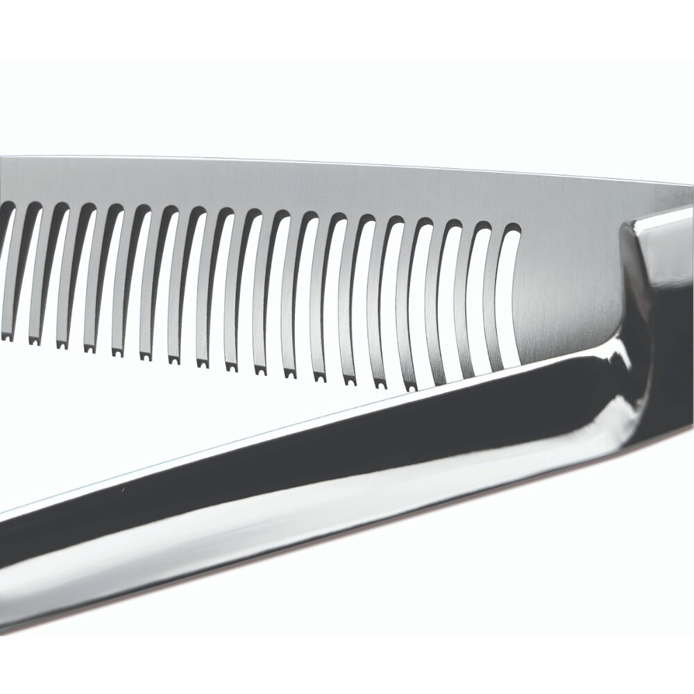 Преміальні філірувальні ножиці мають 33 вигнуті зубці з призматичним зубцюванням, які гарантують максимальну точність і плавність філірування. Завдяки гострому куту заточки ножиці забезпечують чистий і рівний зріз, а технологія внутрішнього заглибленого заточування (Hohlschliff) створює м'яке відчуття при стрижці, що значно полегшує роботу майстра.
