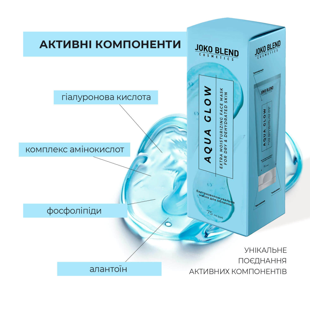 Купити Екстразволожуюча маска для обличчя з гіалуроновою кислотою Joko Blend Aqua Glow Face Mask, 75 мл, ви зможете у нашому інтернет-магазині limonad з доставкою по всій Україні в тому числі і Київ, Дніпро, Одеса, Харків, Запоріжжя, Одеса, Львів та багато інших населених пунктів.