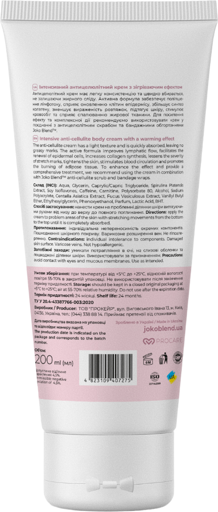 Антицелюлітний крем має легку консистенцію та швидко вбирається шкірою, не залишаючи жирного сліду. Активна формула містить кофеїн, який забезпечує поліпшення лімфотоку та сприяє оновленню клітин епідермісу. Екстракт центелли азіатської збільшує синтез колагену, зменшує вираженість розтяжок, підтягує шкіру та покращує мікроциркуляцію. Екстракт фукусу відмінно зволожує та розгладжує. Насичений активними компонентами крем з зігріваючим ефектом стимулює кровообіг і сприяє спалюванню жирової тканини. Регулярне застосування антицелюлітного засобу допоможе в досягненні гладенької, шовковистої і рівної шкіри. Для посилення ефекту та комплексної дії рекомендуємо використовувати крем у поєднанні з антицелюлітним скрабом та бандажними обгортаннями Joko Blend™.