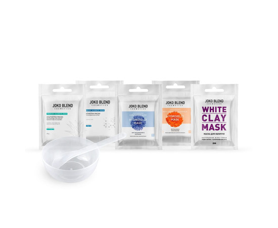 Набір для догляду за обличчям Face Mask Multipack Joko Blend™ включає сет з 5 різних масок: гідрогелева Beta-Carotene Calendula, гідрогелева Cornflower Glow, альгінатна з гіалуроновою кислотою, альгінатна заспокійлива з екстрактом зеленого чаю і алое вера та біла глиняна White Сlay Mask. Маски вдало доповнять базовий догляд за шкірою обличчя. З кожним застосуванням засобів шкіра обличчя стає більш гладенькою, інтенсивно зволоженою та пружною. До набору входять ємність та шпатель для замішування масок.