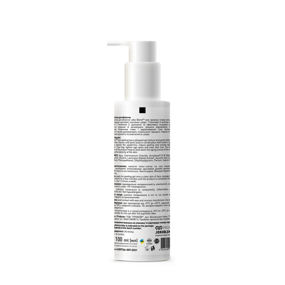 Пілінг-скатка для обличчя Joko Blend™ створена для глибокого очищення та делікатного оновлення шкіри без механічного впливу. Засіб має приємну гелеву консистенцію, м'яко відлущує ороговілі частинки шкіри. Спеціальна формула на основі гліколевої та молочної кислот у поєднанні з вітаміном С очищає та звужує пори, зменшує лущення, вирівнює тон і рельєф, надаючи шкірі свіжість і здорове сяйво. Сприяє освітленню слідів постакне та пігментних плям. Aha-кислоти полегшують проникнення в шкіру засобів подальшого догляду, підсилюючи їх ефективність. Антиоксидантні властивості засобу допомагають сповільнити процеси старіння епідермісу, підвищуючи пружність та еластичність шкіри. Пілінг підходить для всіх типів шкіри, в тому числі для чутливої, оскільки не містить абразивних частинок, має делікатний, ніжний вплив на шкіру та не травмує епідерміс. Засіб рекомендується використовувати 1-2 рази на тиждень. При регулярному використанні має накопичувальний ефект, що сприяє більш ефективному догляду за шкірою. Має приємний ніжний аромат.