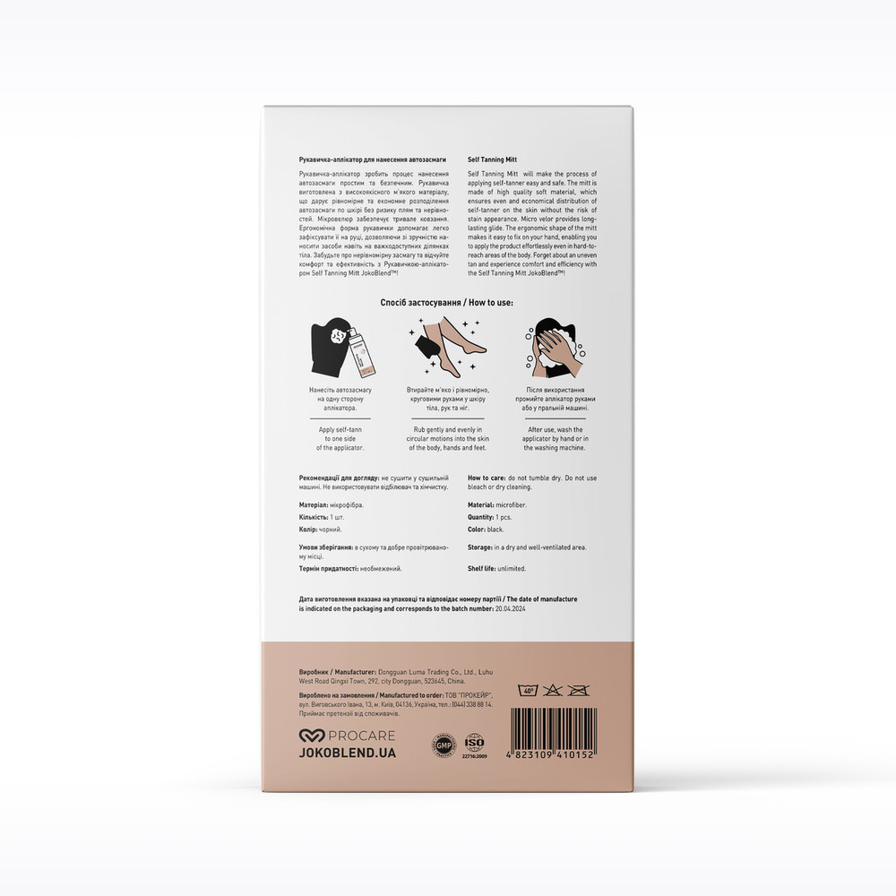 Рукавичка-аплікатор зробить процес нанесення автозасмаги простим та безпечним. Рукавичка виготовлена з високоякісного м'якого матеріалу, що дарує рівномірне та економне розподілення автозасмаги по шкірі без ризику плям та нерівностей. Мікровелюр забезпечує тривале ковзання. Ергономічна форма рукавички допомагає легко зафіксувати її на руці, дозволяючи зі зручністю наносити засоби навіть на важкодоступних ділянках тіла. Забудьте про нерівномірну засмагу та відчуйте комфорт та ефективність з Рукавичкою-аплікатором Self Tanning Mitt JokoBlend™!