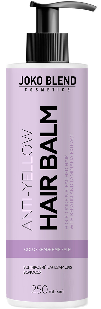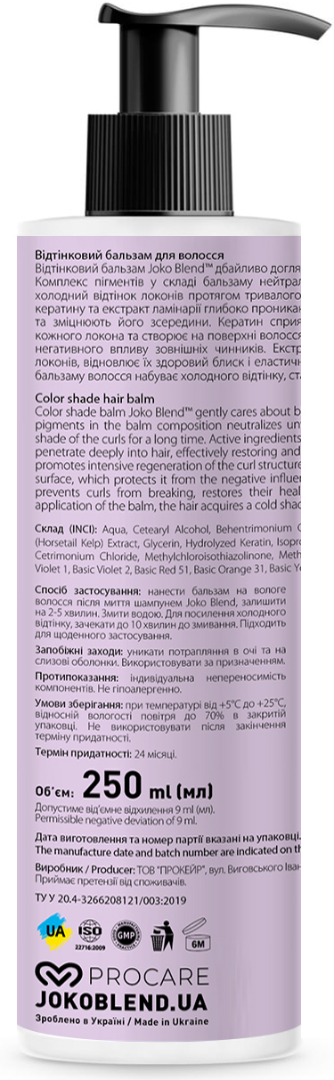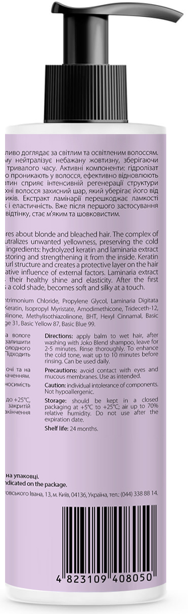 Відтінковий бальзам Joko Blend™ дбайливо доглядає за світлим та освітленим волоссям. Комплекс пігментів у складі бальзаму нейтралізує небажану жовтизну, зберігаючи холодний відтінок локонів протягом тривалого часу. Активні компоненти: гідролізат кератину та екстракт ламінарії глибоко проникають у волосся, ефективно відновлюють та зміцнюють його зсередини. Кератин сприяє інтенсивній регенерації структури кожного локона та створює на поверхні волосся захисний шар, який уберігає його від негативного впливу зовнішніх чинників. Екстракт ламінарії перешкоджає ламкості локонів, відновлює їх здоровий блиск і еластичність. Вже після першого застосування бальзаму волосся набуває холодного відтінку, стає м'яким та шовковистим.