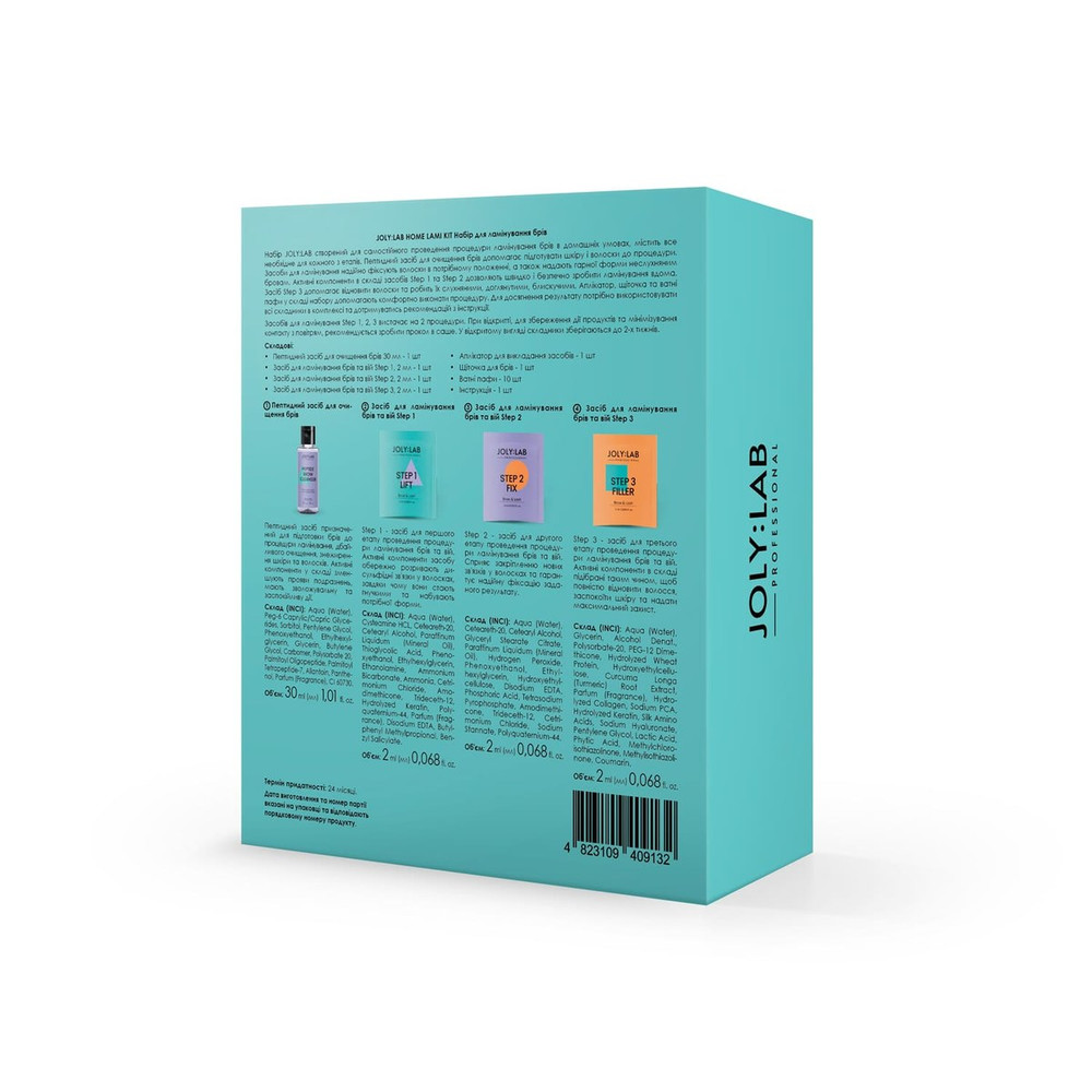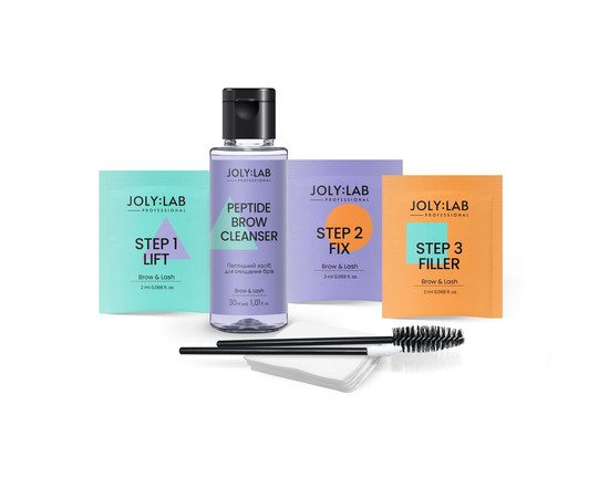 Набір Home Lami Kit JOLY:LAB створений для самостійного проведення процедури ламінування брів в домашніх умовах, містить все необхідне для кожного з етапів. Пептидний засіб для очищення брів допомагає очистити та підготувати шкіру і волоски до процедури. Засоби для ламінування надають надійну та довготривалу фіксацію всім типам волосків, включаючи неслухняні та жорсткі. Активні компоненти засобів дозволяють швидко, ефективно та безпечно провести процедуру ламінування навіть вдома, а доглядові – роблять волоски слухняними й блискучими. Набір також містить аплікатор, щіточку та ватні пафи, які допомагають комфортно виконати процедуру. Ефект ламінування тримається до 8 тижнів.