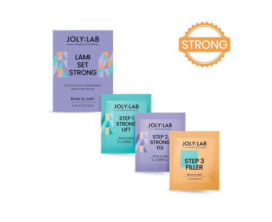 Інноваційна система Strong JOLY:LAB створена для професійного ламінування брів та вій. Включає три потужні склади швидкої дії для фіксації волосків, що мають доглядові властивості, сприяють відновленню і росту брів та вій.