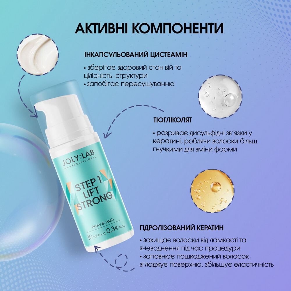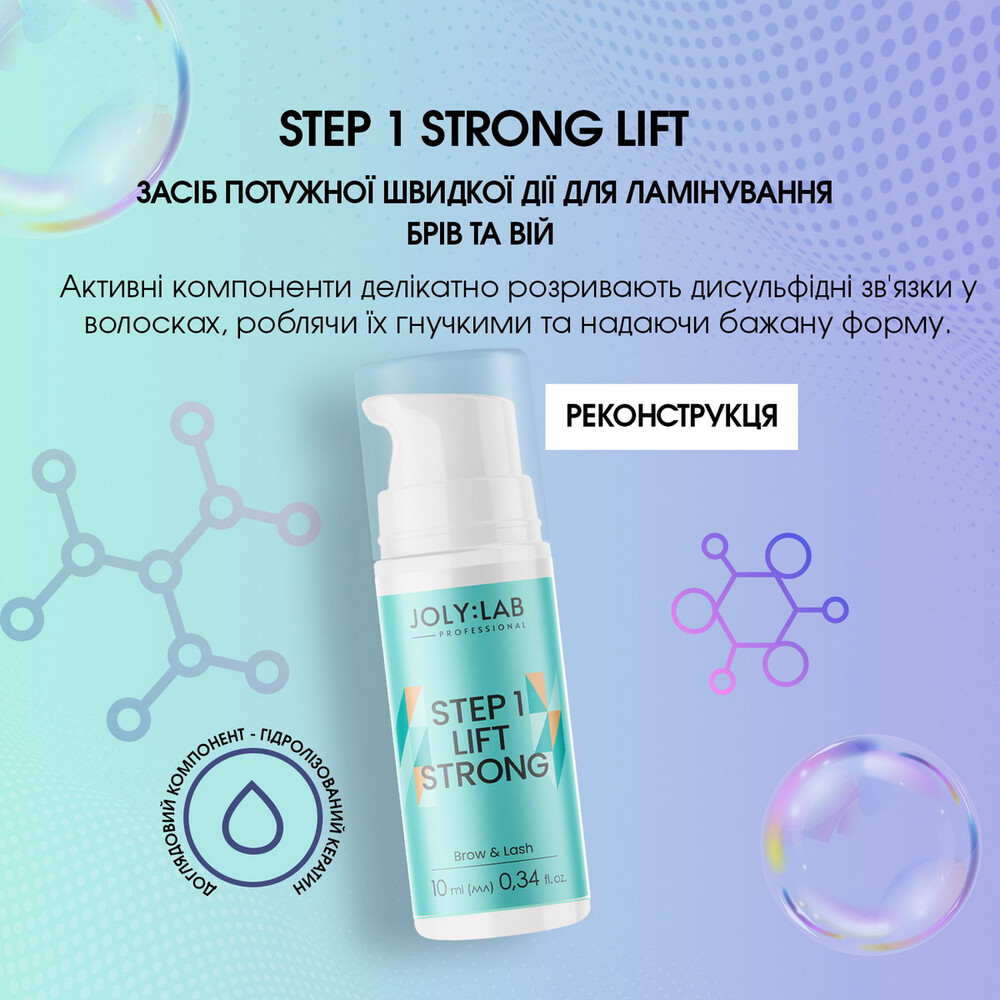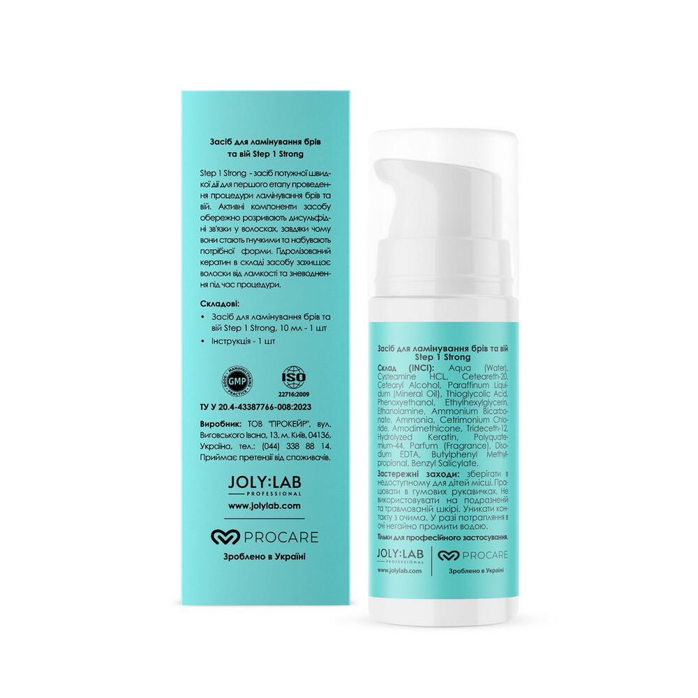 Step 1 STRONG LIFT JOLY:LAB - засіб потужної швидкої для першого етапу проведення процедури ламінування брів та вій, а саме - реконструкції. Активні компоненти засобу обережно розривають дисульфідні зв'язки у волосках, завдяки чому вони стають гнучкими та набувають потрібної форми.
