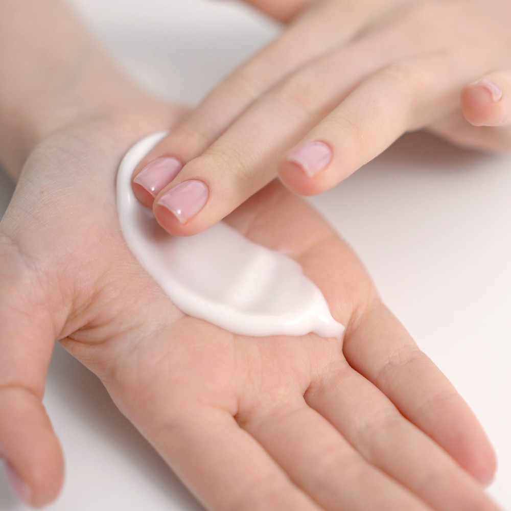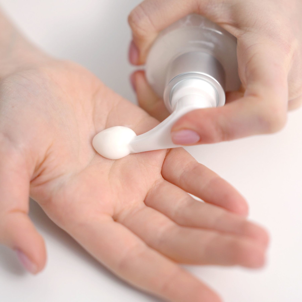 - Налийте невеличку кількість (1 дозатор) вершків в долонь, додайте трішки води і вспіньте, утримуючі рідку емульсію