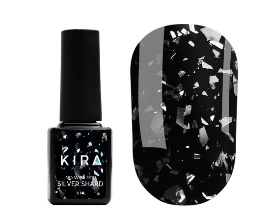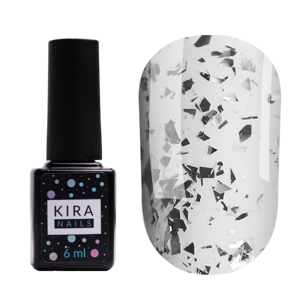 Kira Nails No Wipe Silver Shard Top – топ без липкого шару зі срібною поталлю, ідеально наноситься на нігтьову пластину з першого разу, можете самостійно регулювати кількість декору в покритті, УФ-фільтри захистять колір і блискітки від вигорання і зміни відтінку.