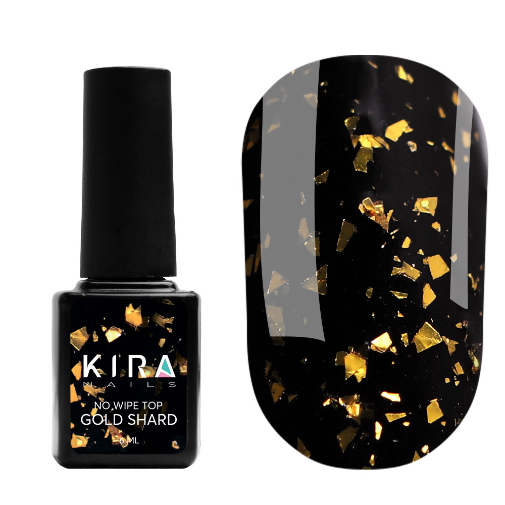 Kira Nails No Wipe Gold Shard Top – топ без липкого шару із золотою поталлю, ідеально наноситься на нігтьову пластину з першого разу, можете самостійно регулювати кількість декору в покритті, УФ-фільтри захистять колір і блискітки від вигорання і зміни відтінку.