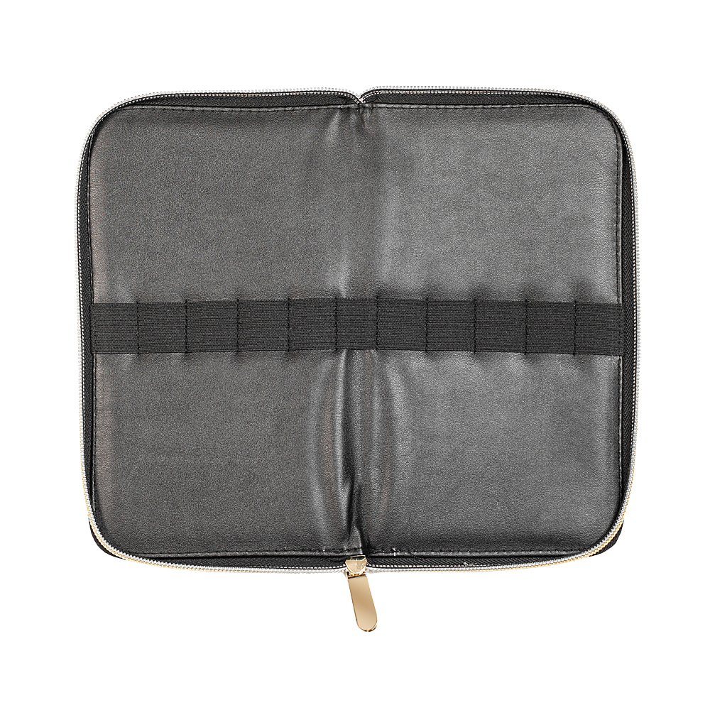 У чохлі також можна зберігати компактні пензлі для макіяжу, інструменти для нарощування вій та моделювання брів, косметичні олівці та інше. Усередині чохол обшитий м'якою штучною шкірою та містить гумовий фіксатор, розрахований на 11 кистей. У відкритому вигляді забезпечує зручний доступ до всього вмісту. Закривається за допомогою блискавки по периметру.
