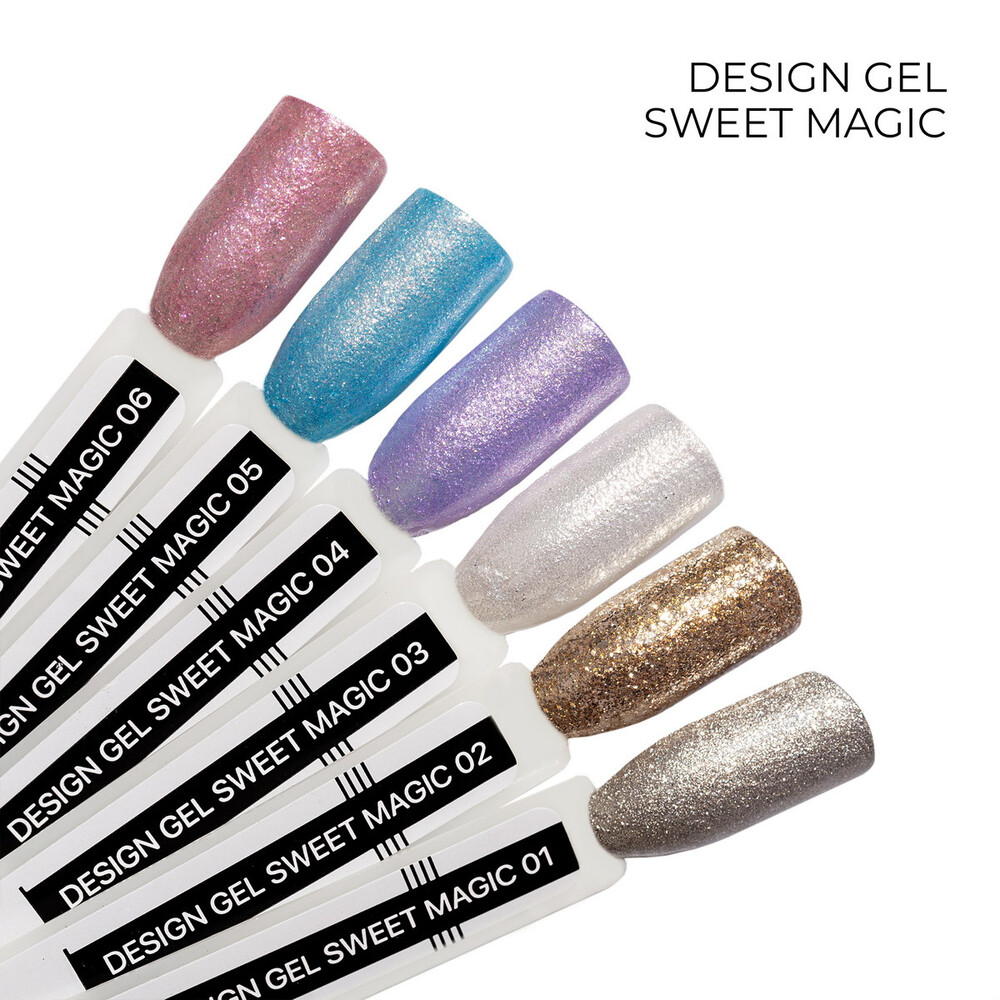 Продукти Sweet Magic мають консистенцію середньої густоти, тому з ними легко і комфортно працювати. Вони мають еластичну, але м'яку текстуру, тому гель не рекомендується застосовувати для нарощування або зміцнення нігтів. Відтінок №06 — красивий сяючий рожевий.