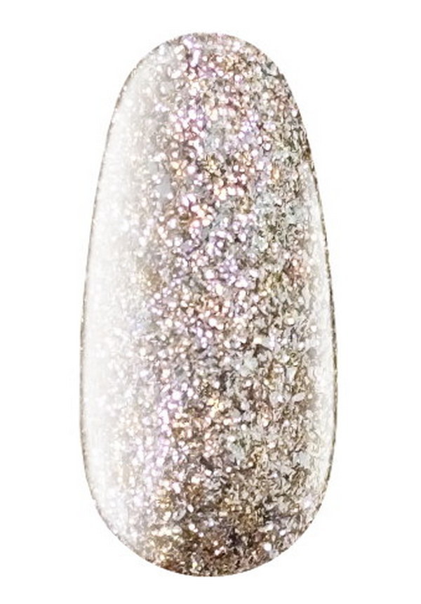 Колір №09 PM — розкішне біле золото з досить крупними мерехтливими частинками. Продукт лягає щільно, вже один тонкий шар повністю перекриває ніготь. Він ефектно виблискує в денному та при штучному світлі, але при цьому виглядає благородно та стримано. Має збалансовану середньогусту консистенцію, просто наноситься пензлем і не розтікається.