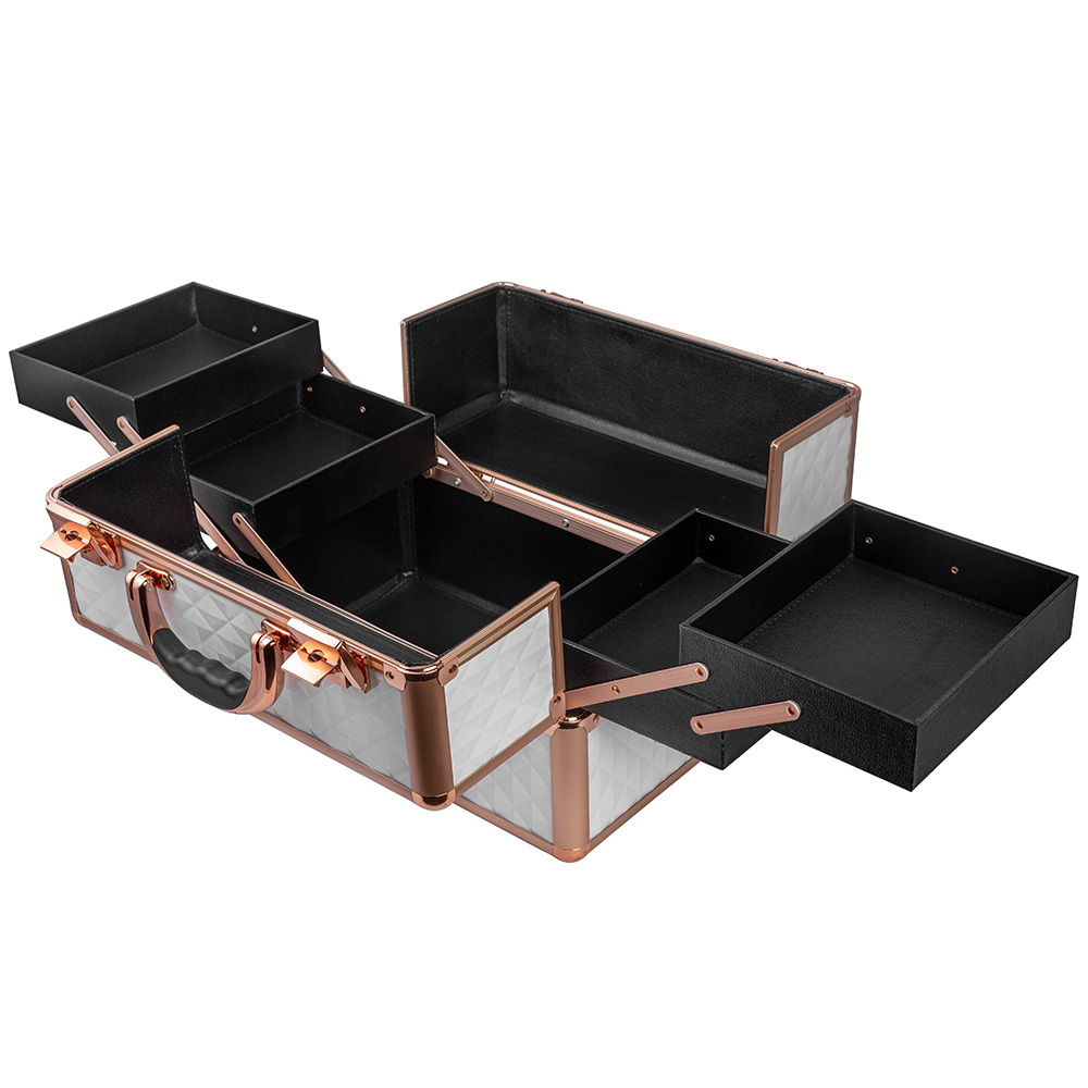 Універсальний кейс №44 підійде майстру будь-якого профілю. Ця модель привертає увагу за рахунок вишуканого лаконічного дизайну, який задовольняє естетичні уподобання та допомагає підкреслити стиль майстра. Зовнішня обробка виконана з білого фактурного пластику і доповнена алюмінієвими елементами у відтінку рожевого золота. Для зручного перенесення передбачена міцна ручка. Закривається кейс на два клапанні фіксатори.