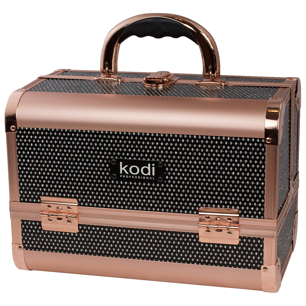 Кейс № 45, оформлений у дизайні під назвою «чорний діамант» привертає увагу за рахунок контрастного поєднання декоративних матеріалів, що створює ефект мерехтіння. Такий професійний аксесуар ідеально доповнить робочу стилістику майстра. Зовнішнє оздоблення виконане з чорного текстурованого ПВХ та доповнено каркасними елементами у відтінку «рожеве золото». Для зручного перенесення кейс оснащений ручкою. Кейс закривається на клапанний замок.