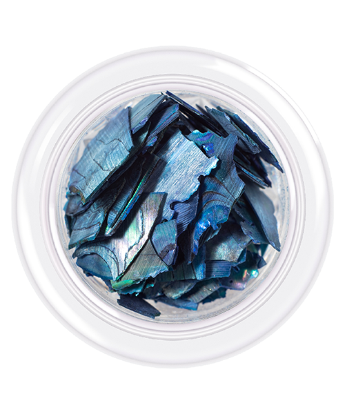 У коробочці ви знайдете справжні шматочки натурального перламутру, пофарбованого в різні відтінки. Перламутр має дуже тонку та податливу структуру, з ним легко та комфортно працювати, постійно експериментуючи з формою та розміром частинок. Черепашки можна використовувати в акваріумному дизайні, а можна прикрасити ними гель-лак, виклавши цікавий візерунок. Єдина складність полягатиме у виборі кольору, адже колекція налічує 10 оригінальних колірних рішень. Відтінок №05 — насичений синій з перламутровим переливом.