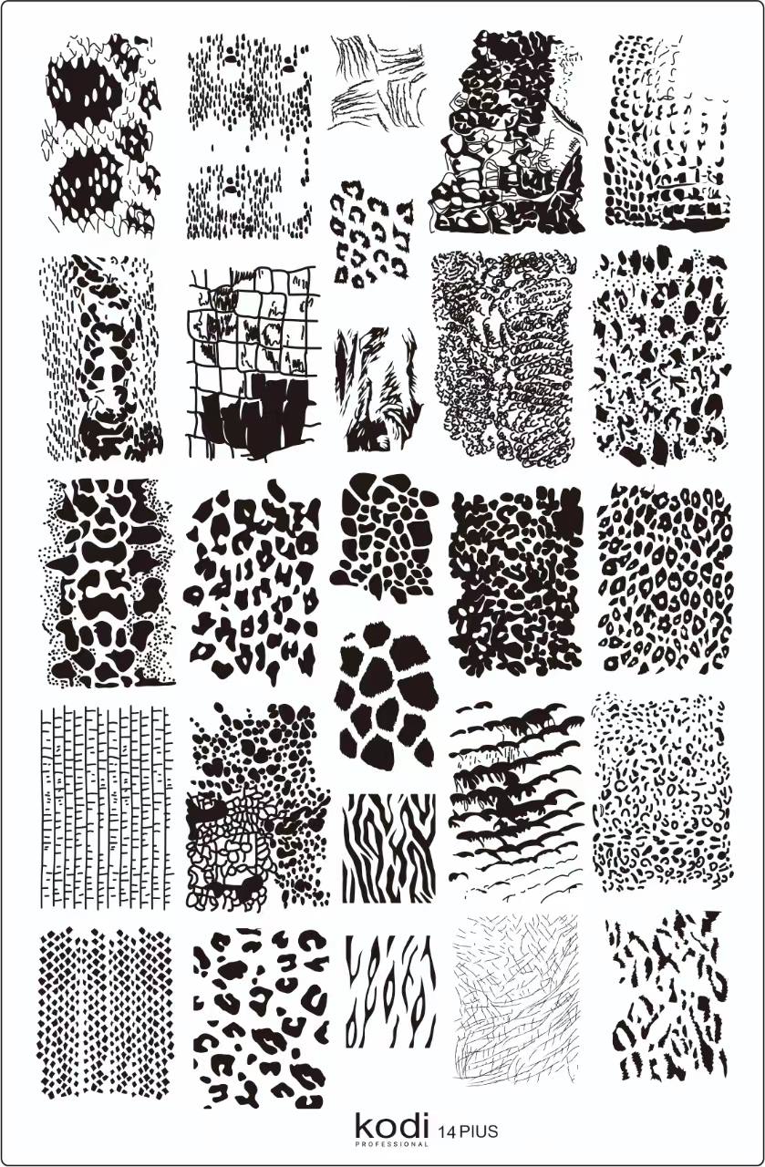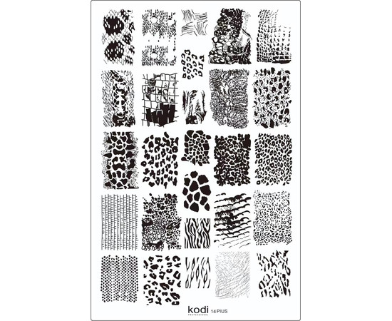 Анімалістичний принт впевнено очолив список найгарячіших трендів сезону на модних показах і плавно перекочував у манікюр. Відтворити “звірячу текстуру” на нігтях у техніці ручного розпису досить складно та затратно за часом, але на допомогу майстрам приходить стемпінг.Спеціальна пластина для стемпінгу №14, розроблена провідними експертами популярного, міжнародного бренду Kodi Professional, — металевий лист із нанесеним на нього гравіюванням у вигляді різних анімалістичних принтів. Нанесіть гель-лак або фарбу і насолоджуйтесь ідеально чіткими тонкими лініями з бездоганною симетричністю. Сам процес створення трендового дизайну займе у вас лише кілька хвилин і не потребує високих художніх навичок.