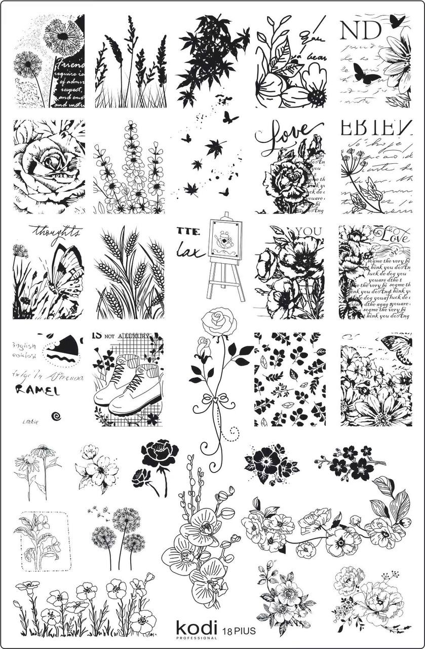 Маючи в арсеналі гель-фарбу, штамп і набір пластин, навіть новачок без особливих художніх навичок зможе створити приголомшливий, креативний дизайн, що привертає увагу. Відомий, міжнародний бренд Kodi Professional пропонує широкий асортимент товарів для стемпінгу, серед яких і універсальна пластина для стемпінгу №18, що є тонким листом металу з нанесеним на нього гравіюванням у вигляді квіткового принту (флористика).