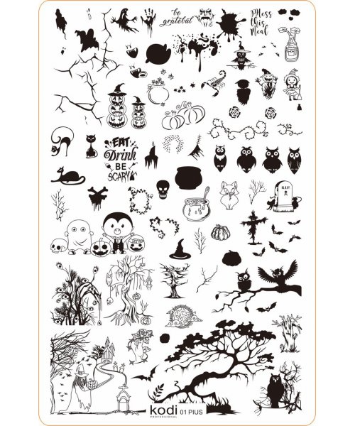 Пластина № 01 з серії Plus size виконана з металу і містить велике різноманітніття малюнків у тематиці Halloween. Будь-який з представлених на пластині малюнків може стати яскравим акцентом вашого нейл-арту, а також допоможе створити яскравий настрій для незабутнього свята.