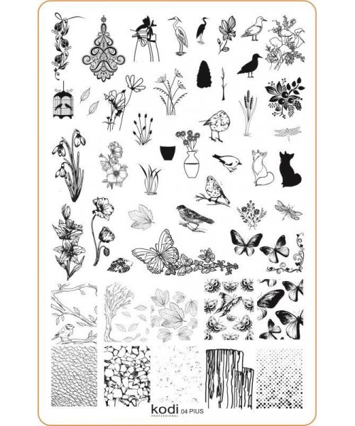 Пластина №04 з серії Plus size виконана з металу і містить велике різноманіття малюнків і візерунків у природному тематиці – натуральні текстури, різні рослини і квіти, птахи і метелики. Нейл-арт з такими малюнками буде виглядати ніжно і ненав'язливо.