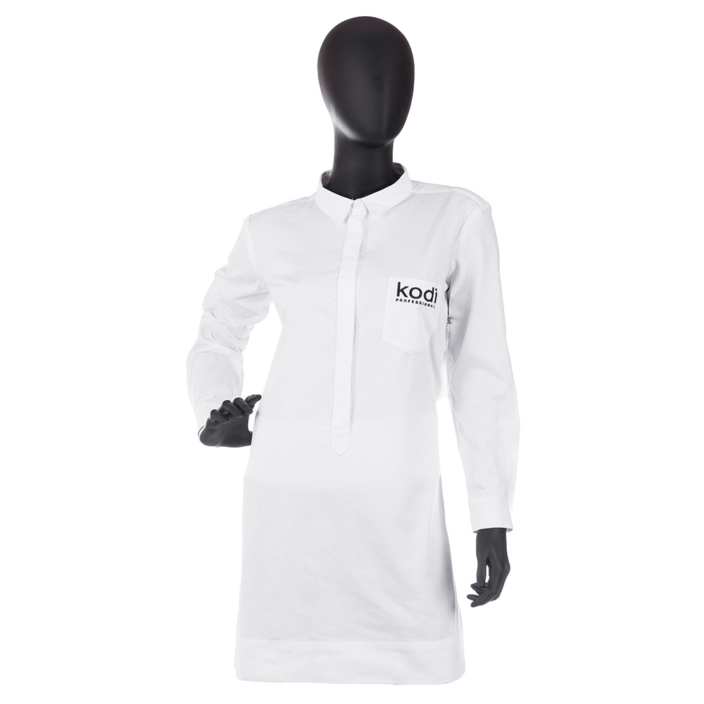 Біла подовжена сорочка-туніка – універсальний елемент професійного гардеробу майстра, що дозволяє створювати стильні та лаконічні образи для будь-якого випадку. Виконана з легкого та дихаючого сорочкового котону, дана модель максимально комфортна в носінні. Сорочка напівприталеного силуету, довжиною до середини стегна, з класичним коміром, подовженою планкою з ґудзиками та довгим рукавом. Є нагрудна кишеня.