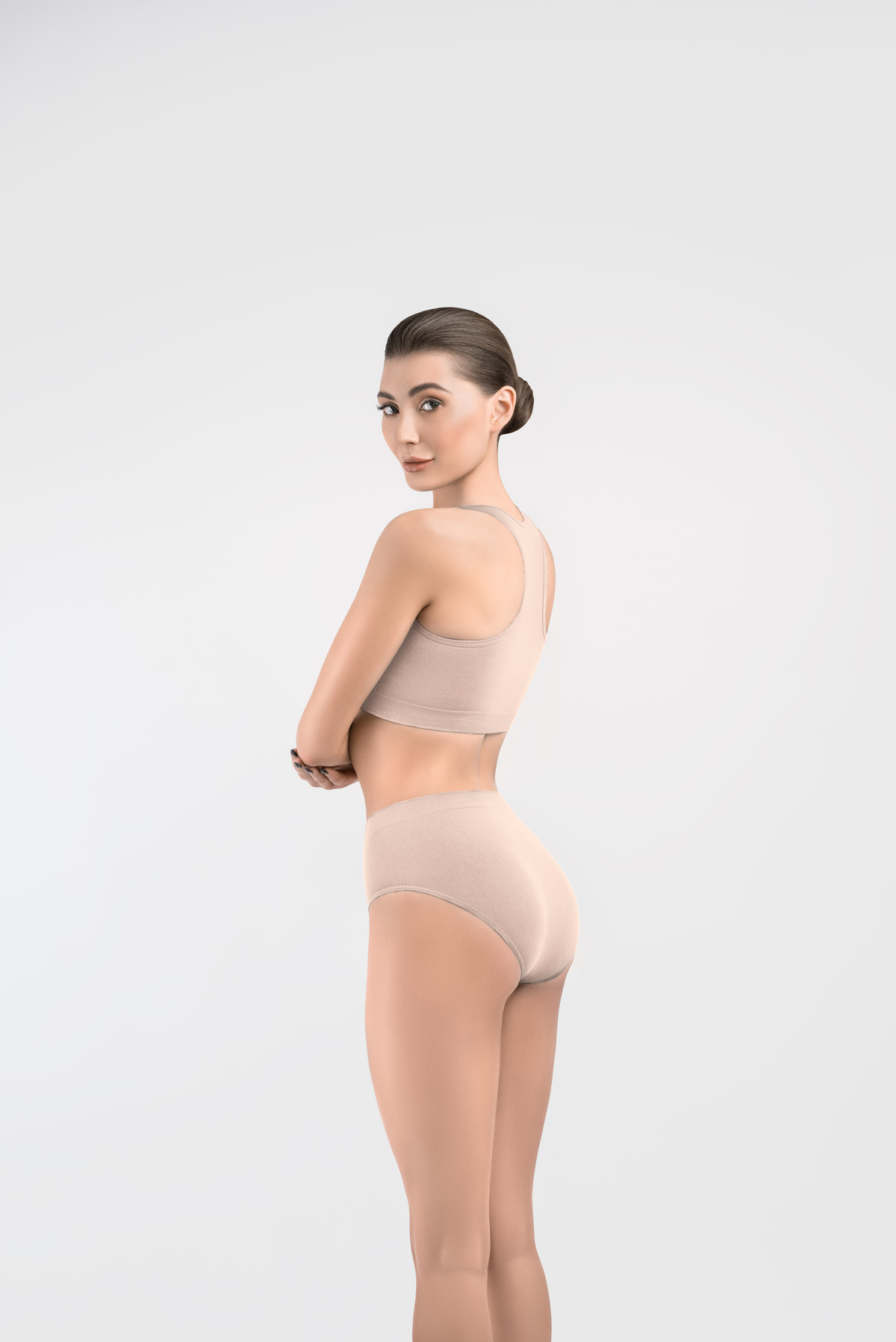 Модельний ряд представлений базовими топами, майками та трусами. До переваг даного виду білизни можна віднести ідеальне прилягання до тіла, свободу рухів та абсолютний комфорт через відсутність грубих виступаючих швів. Топ з м'якими вставними філіжанками підходить як для роботи, так і для занять спортом. М'яка гумка під грудьми та широкі бретелі забезпечують оптимальну підтримку грудей. Позаду модель оформлена у вигляді борцівки. Тканина, з якої виготовлений топ, відрізняється м'якістю, міцністю, еластичністю та стійкістю до деформації.